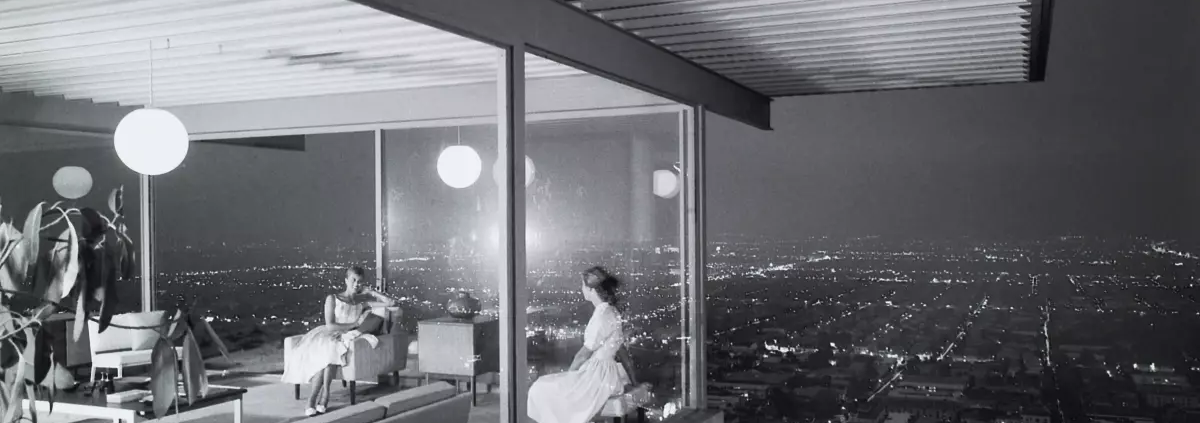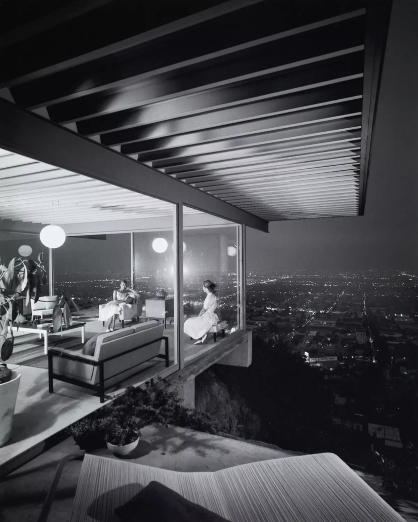 Shortly after the home’s completion, photographer Shulman made a black-and-white photograph that became emblematic of the era. It shows the home at night, with two young women sitting inside in a cantilevered corner, its floor-to-ceiling windows revealing the lights of the L.A. Basin glittering in the background.